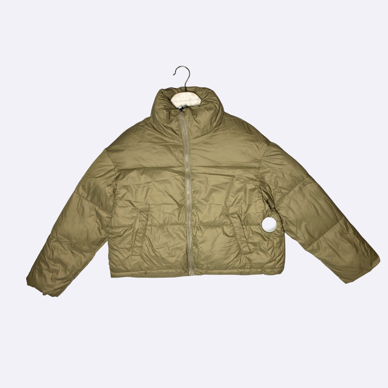 جاكيت نسائي قصير منفوخ ومبطن، يتميز بتصميم عصري وياقة مرتفعة.