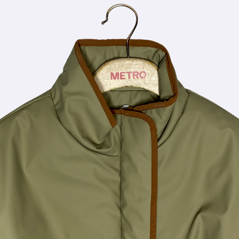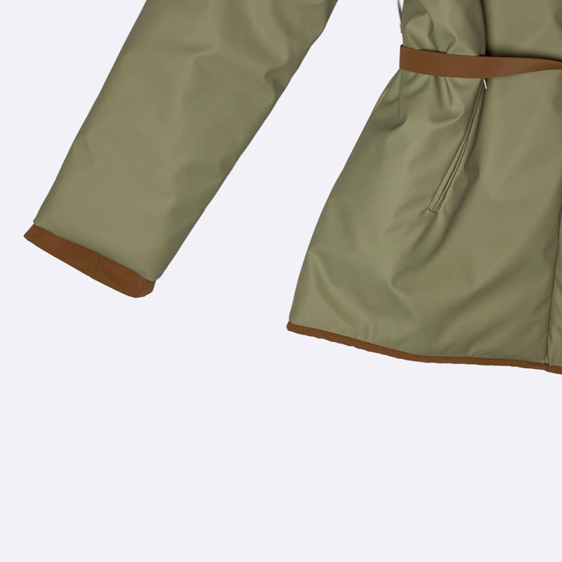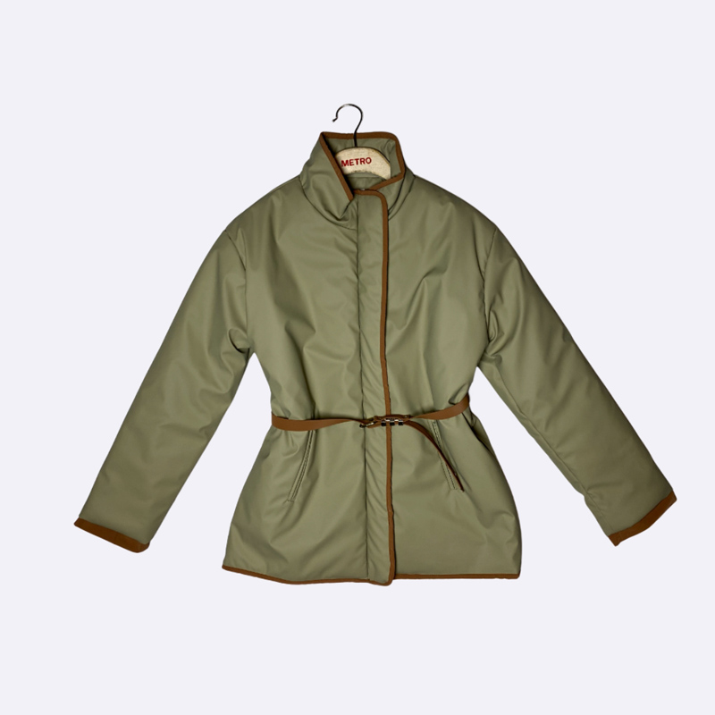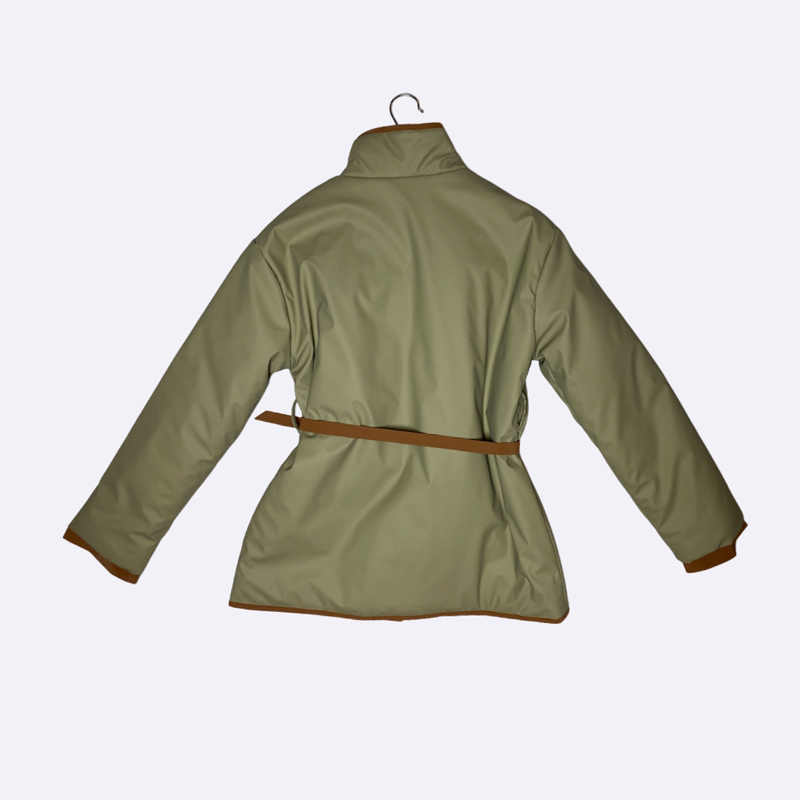 جاكيت نسائي أنيق ومبطّن باللون الزيتوني الفاتح، يتميز بياقة عالية وحواف وحزام من الجلد الصناعي بلون بني متباين.
