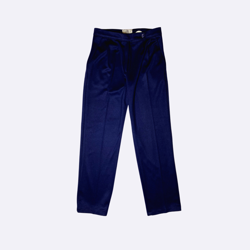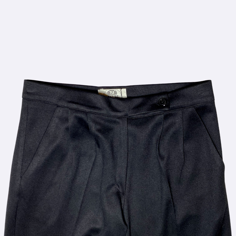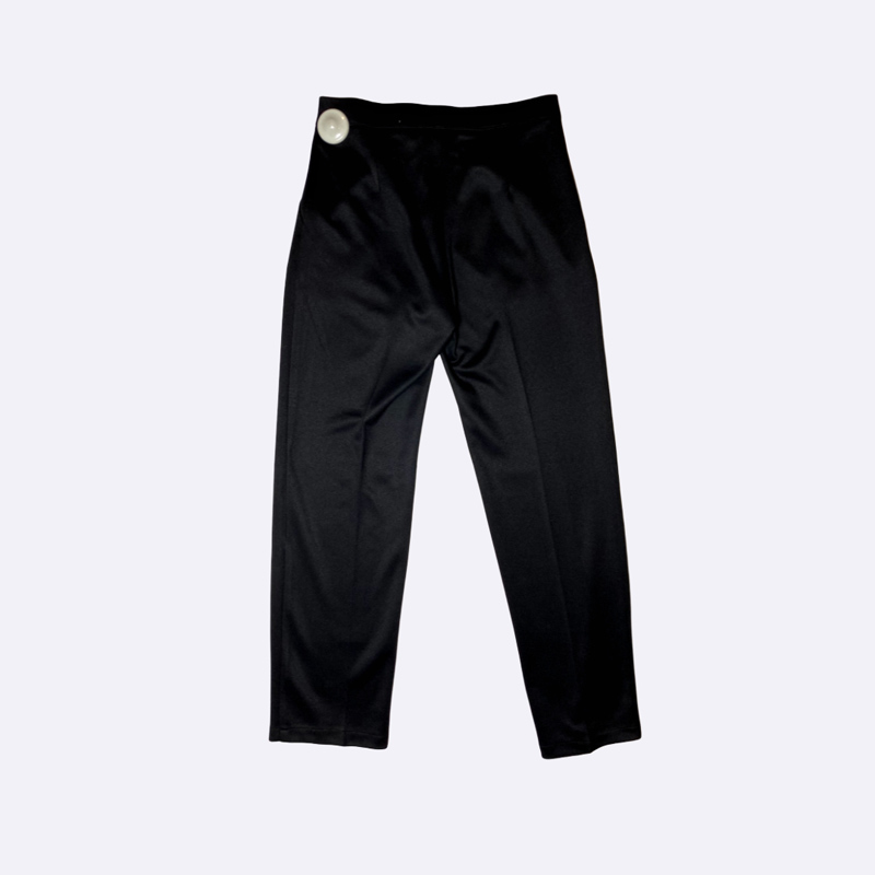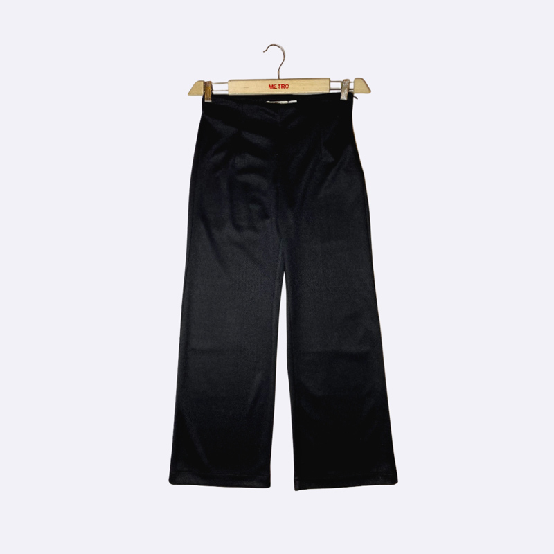 بنطلون نسائي أسود بخصر عالٍ وقصة أرجل واسعة، مصنوع من قماش مطاطي.