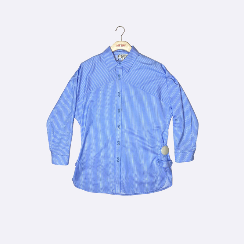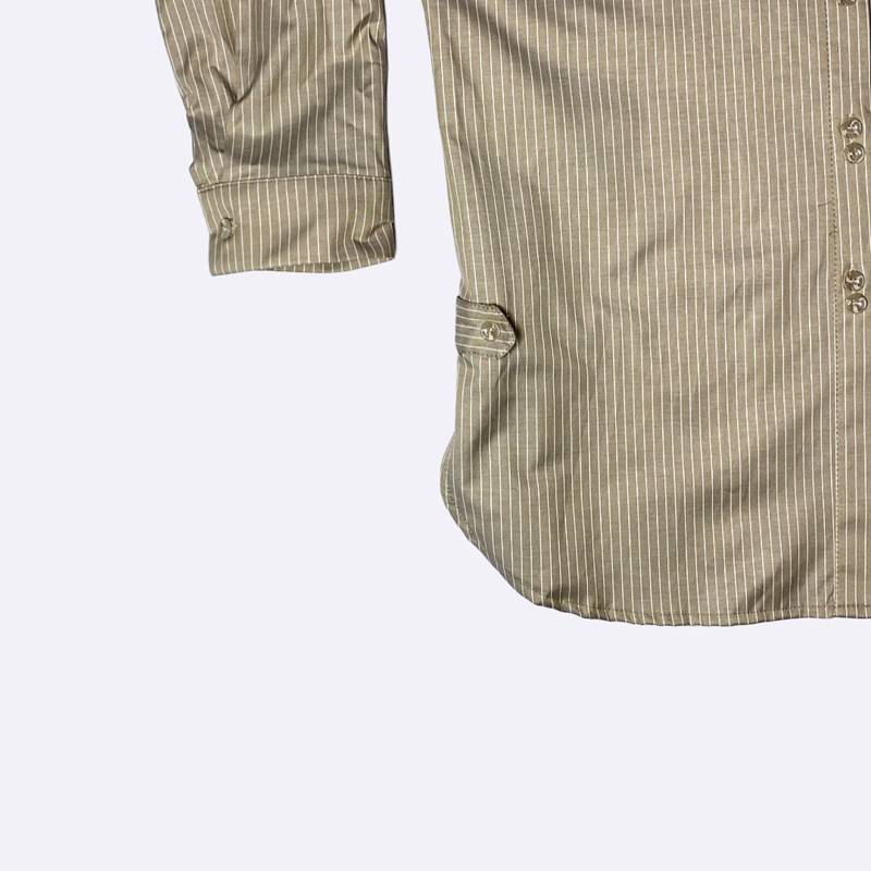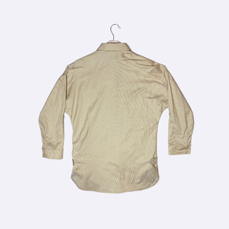 قميص نسائي بأكمام ثلاثة أرباع، يتميز بنقوش مقلمة عمودية بيج/بني فاتح وقصّة على الكتفين بتفاصيل مستوحاة من الطراز الغربي.