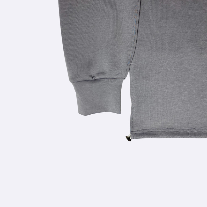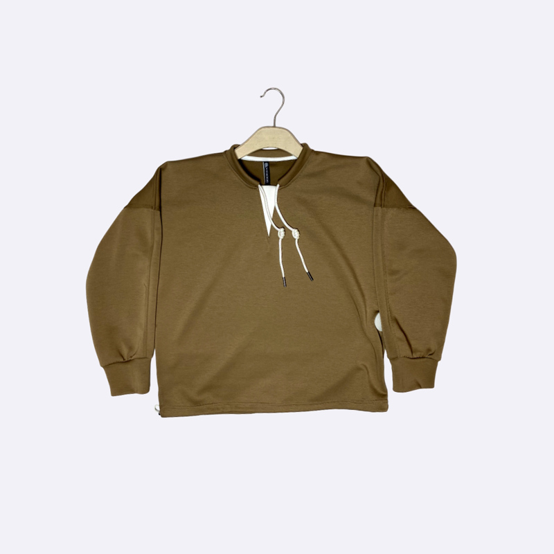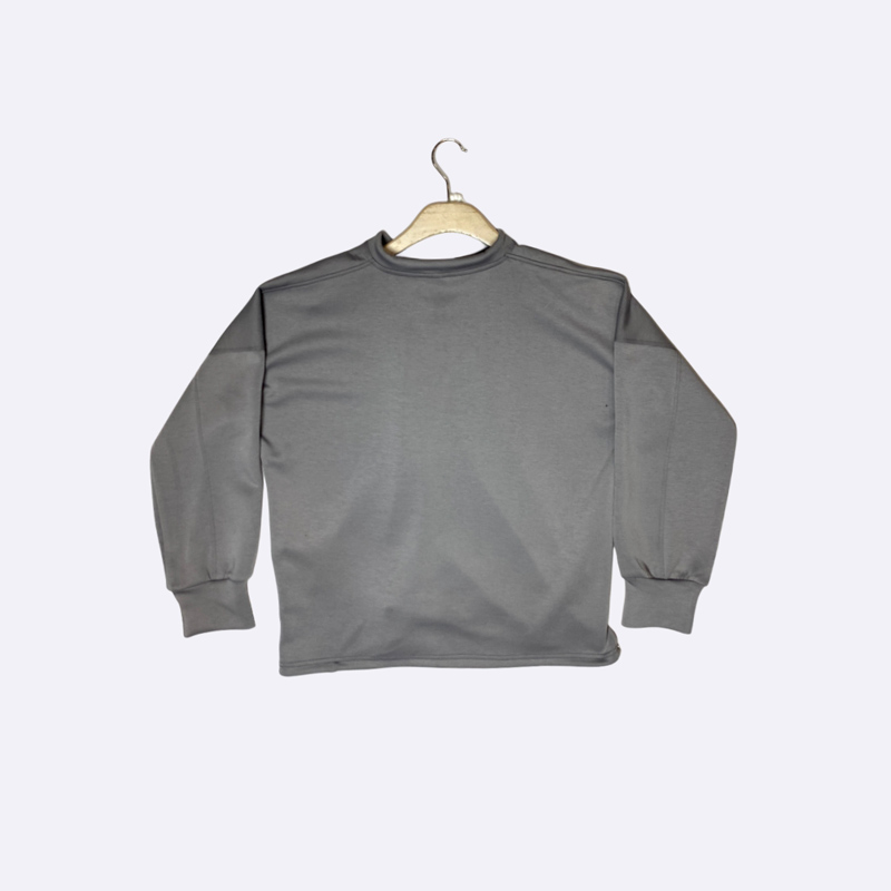 سويت شيرت/كنزة نسائية مريحة بلون رمادي داكن، يتميز بياقة مفتوحة على شكل V مزودة بأربطة بيضاء، مع قصّة كتف عريضة (Dropped Shoulder) مثالي لإطلالة كاجوال.