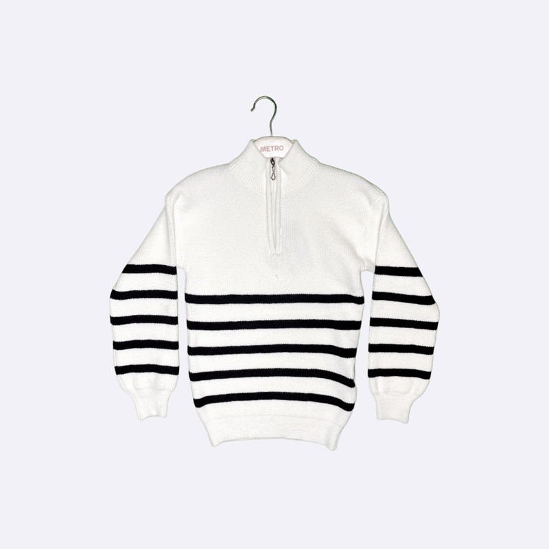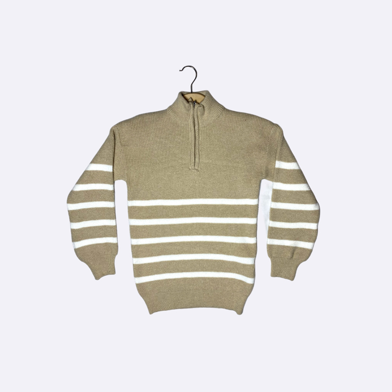 كنزة صوفية نسائية مريحة بلون بيج/جملي مع خطوط أفقية عريضة باللون الأبيض على الصدر والأكمام، تتميز بياقة عالية وسحاب نصفي.
