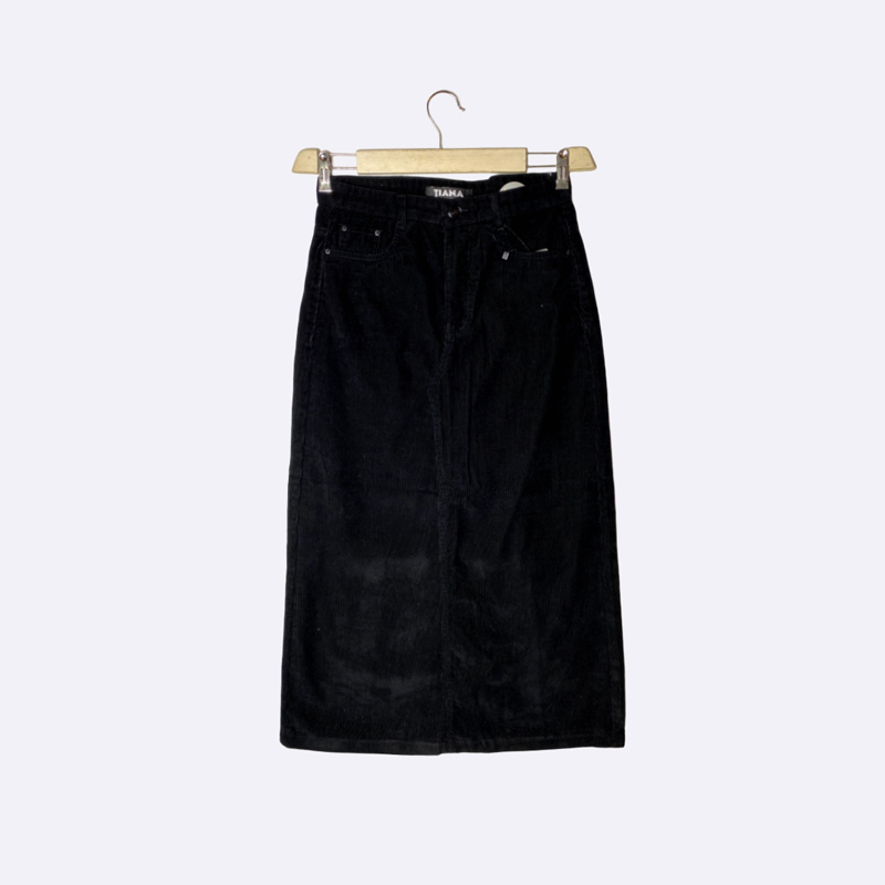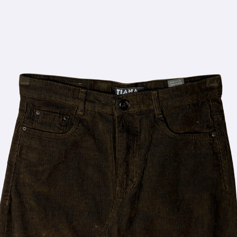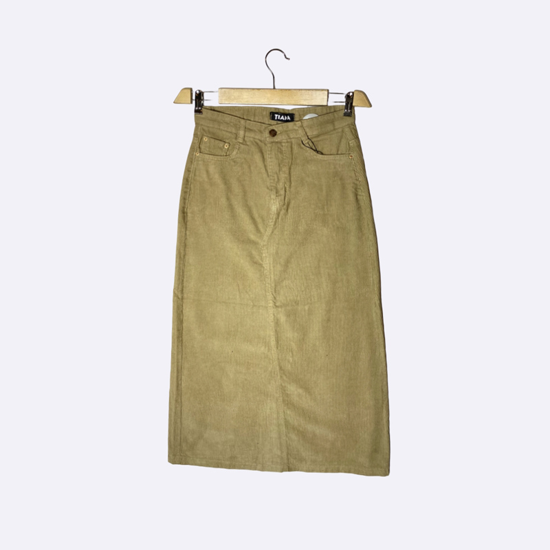 تنورة نسائية كلاسيكية بخصر عالٍ وطول ميدي/ماكسي، مصنوعة من قماش الكوردروي (المخمل المضلع) بلون بني داكن أو زيتوني، مع قصّة مستقيمة أنيقة.