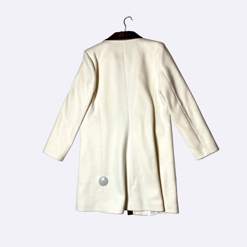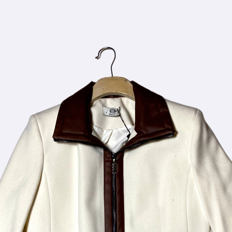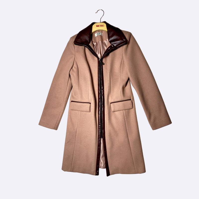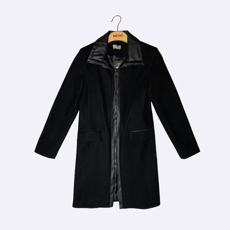 معطف نسائي بتصميم كلاسيكي ومزين بتفاصيل تباين جلدية عند الياقة والسحاب والجيوب.