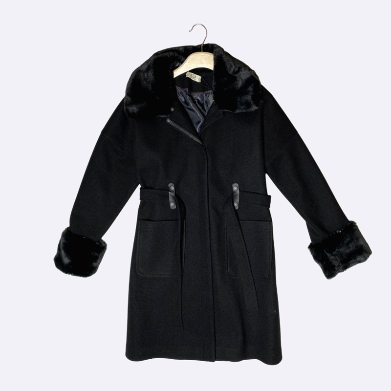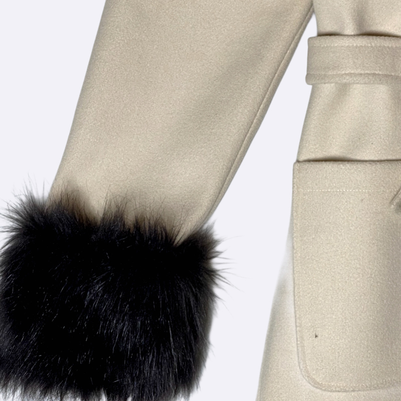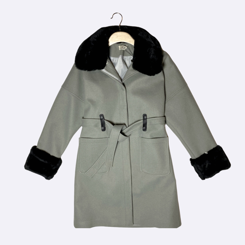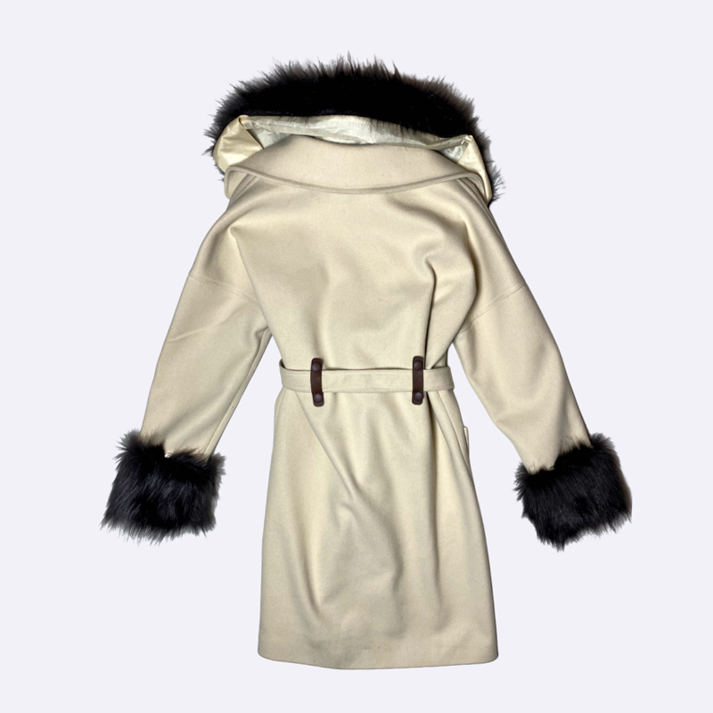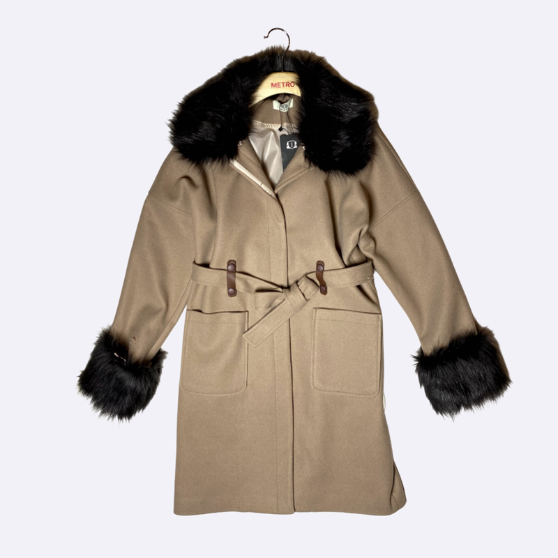 معطف شتوي طويل بأكمام طويلة وقبعة مزينة بفرو صناعي فاخر، وحزام خصر للتحكم في المقاس.