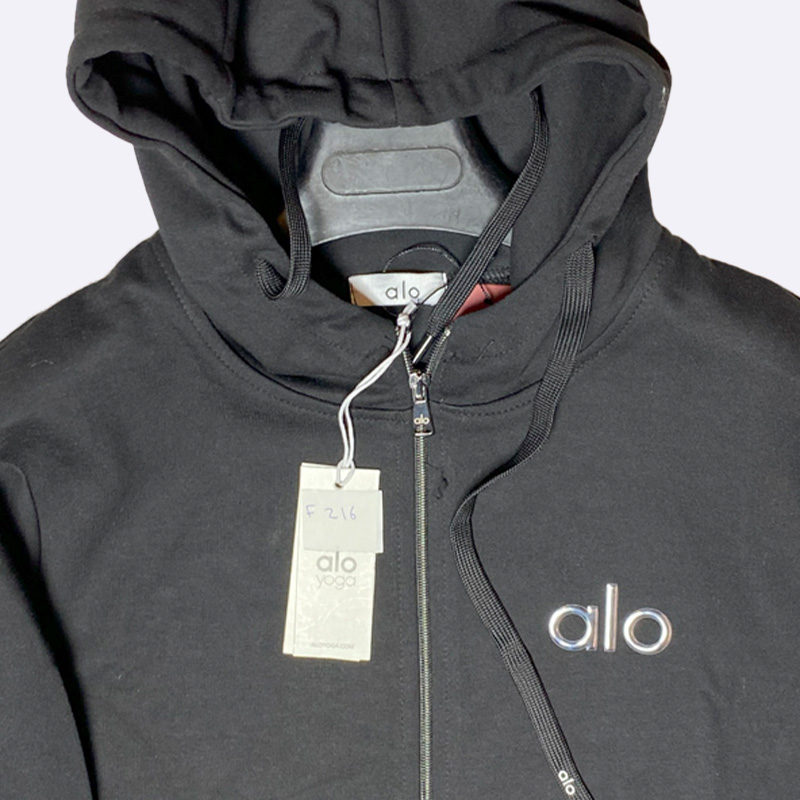 طقم رياضي مريح بلون أسود موحد، يتميز بشعار alo باللون الفضي اللامع لتصميم يجمع بين الرياضة والأناقة اليومية.