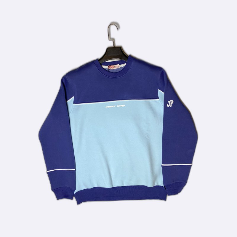 سويت شيرت رجالي بتصميم عصري يعتمد على تداخل كتل الألوان، مزين بطبعة Super Jump وشعار JP على الكم.