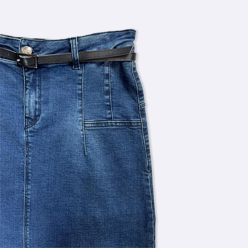 تألقي بإطلالة عصرية مع تنورة الميدي الجينز الأنيقة بحزام. تصميم مريح وعصري يضفي لمسة أنيقة على مظهرك اليومي.