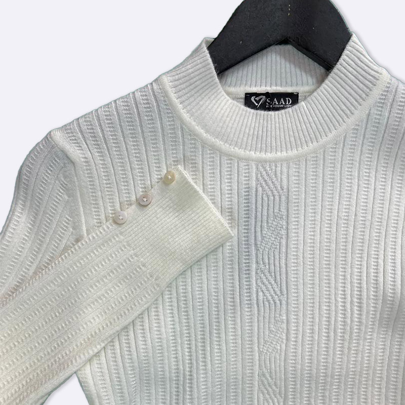 تألقي بإطلالة أنيقة ومريحة مع هذه الكنزة المحبوكة المضلعة. تصميم عصري برقبة عالية ولون عاجي يضفي لمسة من الرقي على مظهرك.