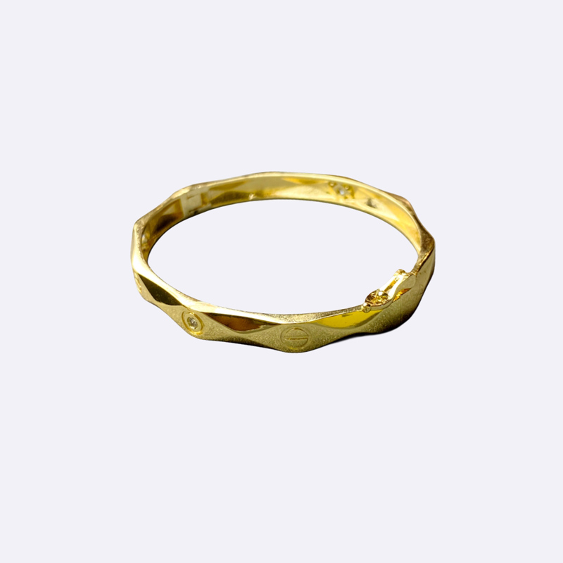 سوار بانجل صلب يتميز بجزء على شكل سلسلة كوبية وجزء آخر على شكل حرفين متداخلين مرصعين بالأحجار.