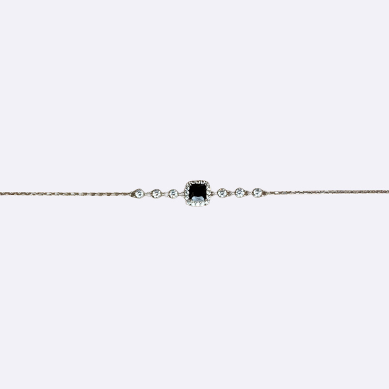 سوار فضي بتصميم سلسلة رقيقة، مرصع بصف من الفصوص اللامعة يتوسطها حجر أسود مربع الشكل.فضة عيار 925