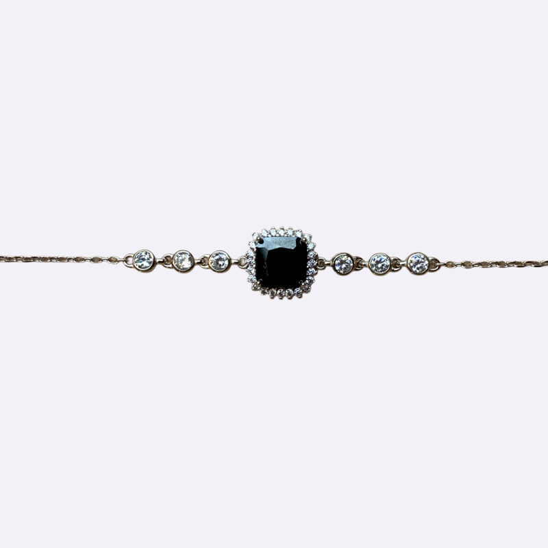 سوار فضي بسلسلة رقيقة، يتميز بحجر أسود مربع مركزي محاط بفصوص بيضاء صغيرة على جانبيه.فضة عيار 925