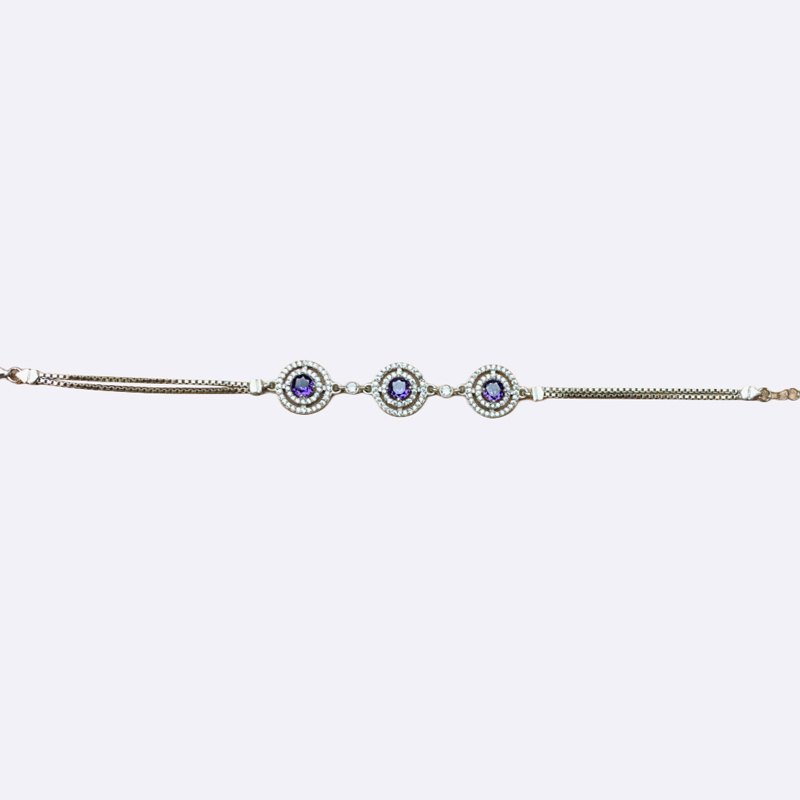 سوار فضي بسلسلة مجدولة، مرصع بثلاثة أحجار أرجوانية دائرية محاطة بدائرة من الفصوص البيضاء المتلألئة.فضة عيار 925