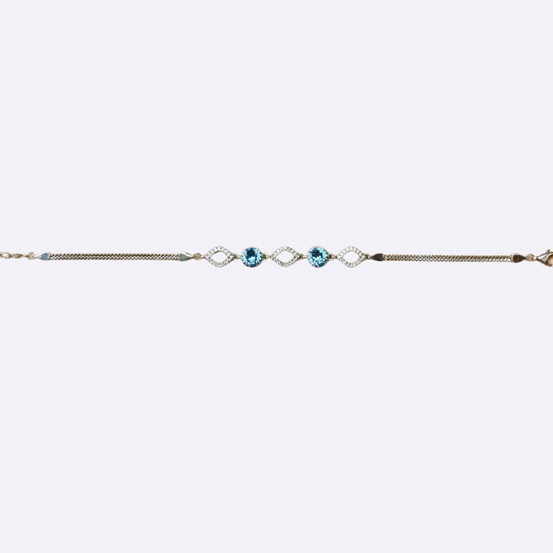 سوار فضي بسلسلة مجدولة، مرصع بحجرين أزرقين دائريين يتوسطان زخارف بيضاوية مرصعة بالفصوص اللامعة.فضة عيار 925
