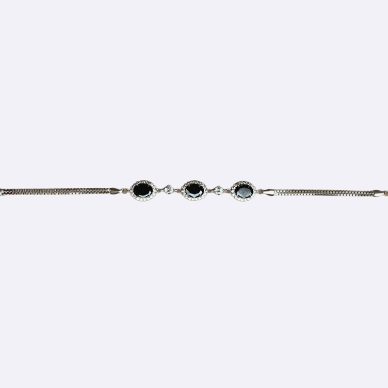 سوار فضي بسلسلة مجدولة، مرصع بثلاثة أحجار سوداء بيضاوية محاطة بفصوص بيضاء صغيرة.فضة عيار 925