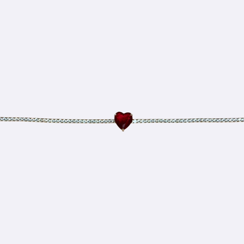 سوار كامل مرصع بالفصوص، يتميز بقلب أحمر كبير مركزي متلألئ، مع لمسة ذهبية وردية خفيفة.فضة عيار 925