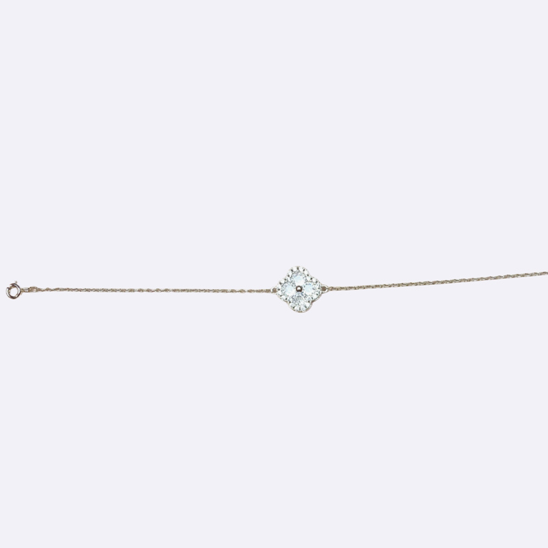 سوار ناعم بسلسلة ودلاية زهرة البرسيم (كلوفر) بالكامل مرصعة بأحجار زركون بيضاء صغيرة لامعة، قطعة كلاسيكية تضفي بريقاً ناعماً على المعصم، مثالية للإهداء.فضة عيار 925