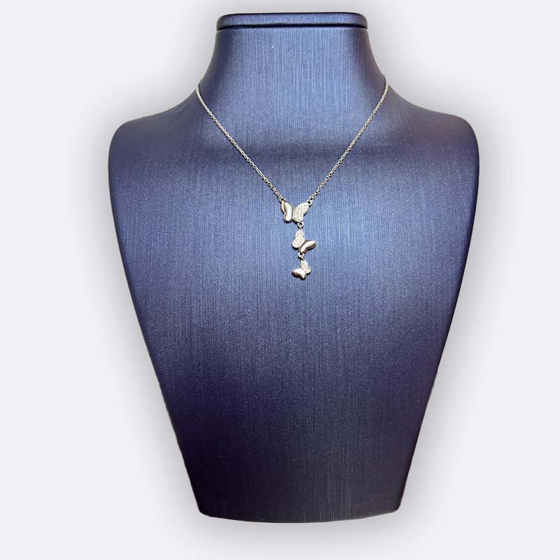 قلادة نسائية من فضة أصلية بتصميم فراشات متدلية أنثوي وكيوت، تعطي لمسة نعومة وحركة خفيفة على الإطلالة. قطعة عصرية وجذابة، مناسبة للاستخدام اليومي وتنسيقها سهل مع الستايل الشبابي.