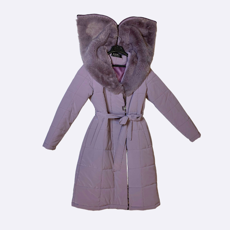 جاكيت طويل مبطن ودافئ بقماش مضغوط "Puffer"، يتميز بغطاء رأس كبير مبطن بالفرو الصناعي وحزام خصر للتحكم بالمقاس.