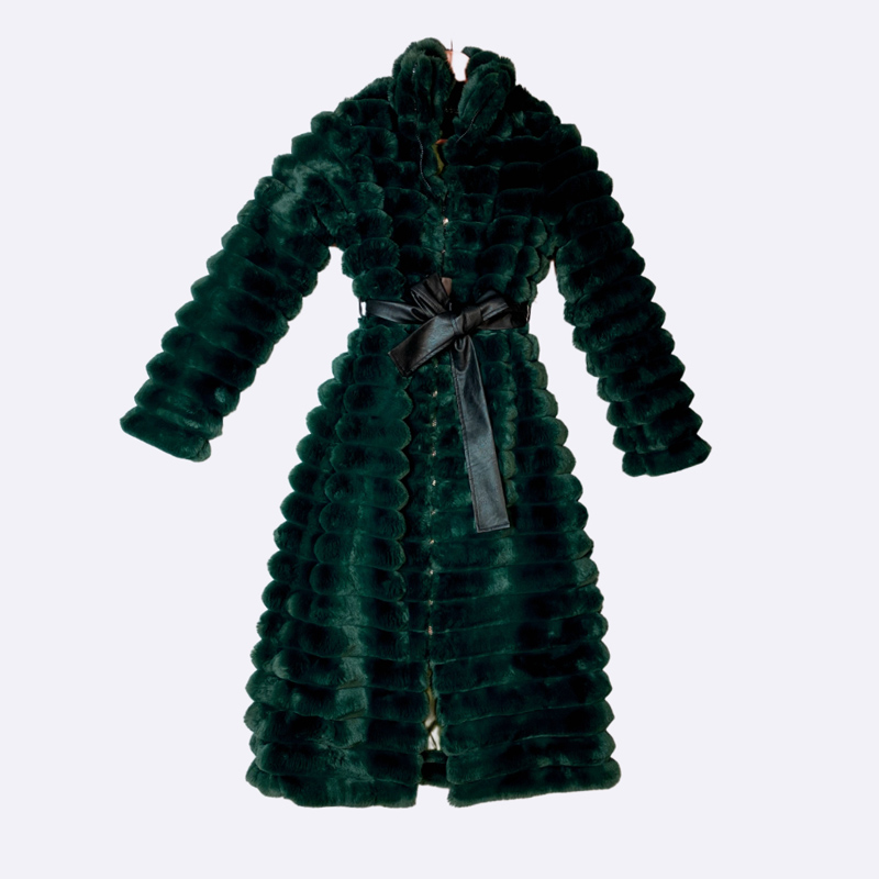 جاكيت فرو صناعي طويل ودافئ بتصميم مميز على شكل طبقات أفقية أو خطوط بارزة، مزود بحزام خصر جلدي للربط.