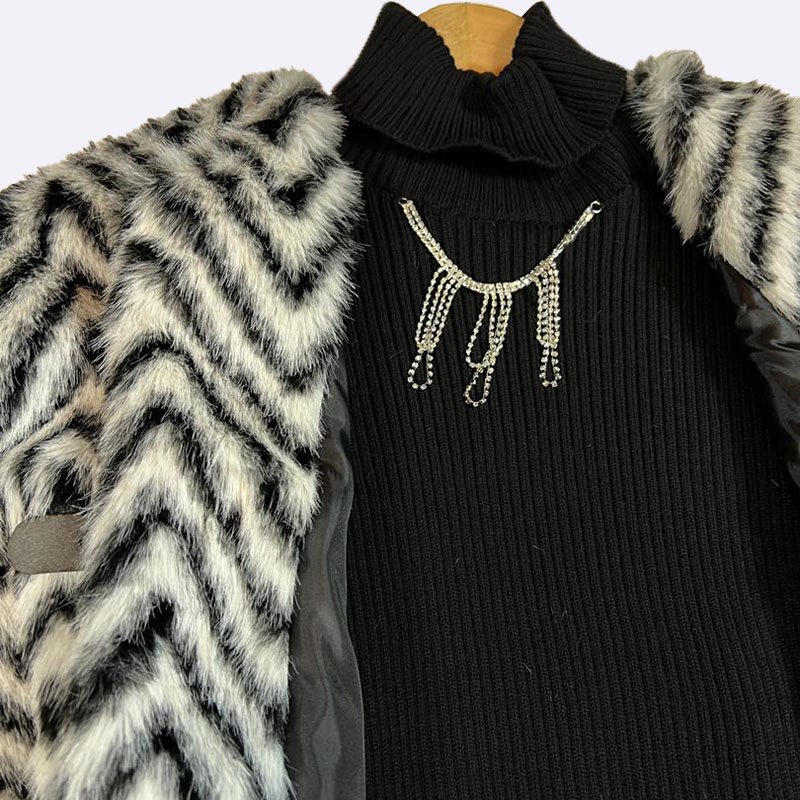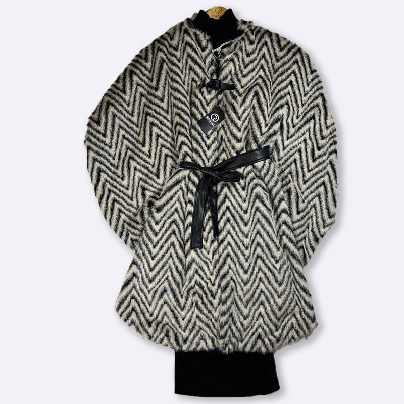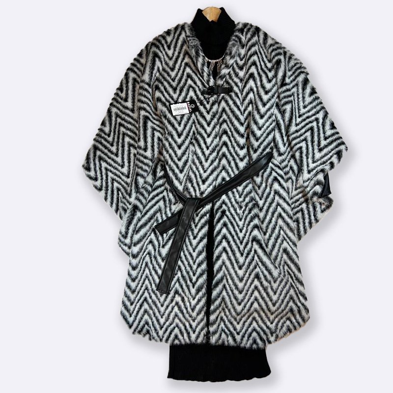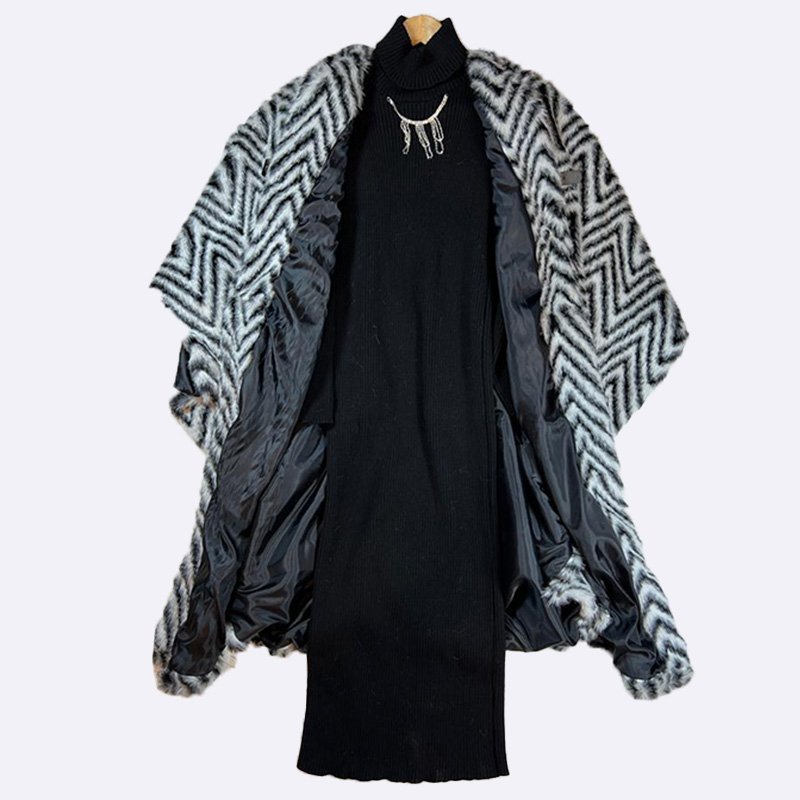 تألقي بإطلالة عصرية مع هذا الطقم الأنيق الذي يضم فستان تريكو مريح وكيب من الفرو الصناعي بنقشة الحمار الوحشي. مثالي لأيام الشتاء الباردة والمناسبات الخاصة.