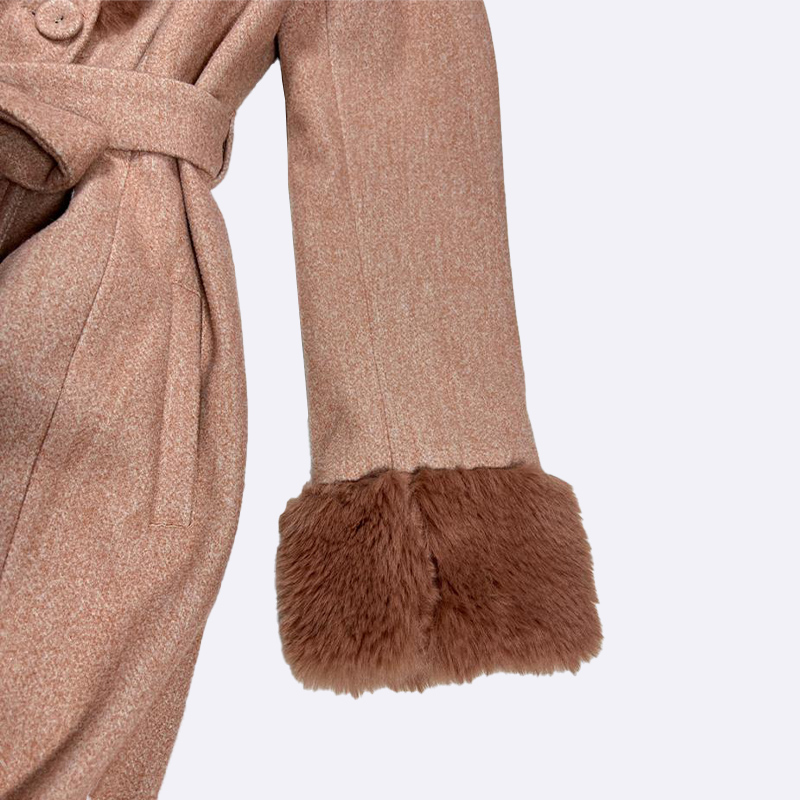 انطلقي بأناقة مع هذا المعطف الصوفي الفاخر بلمسة عتيقة. ياقة وأساور من الفرو الصناعي تضفي فخامة، وحزام الخصر يحدد القوام.