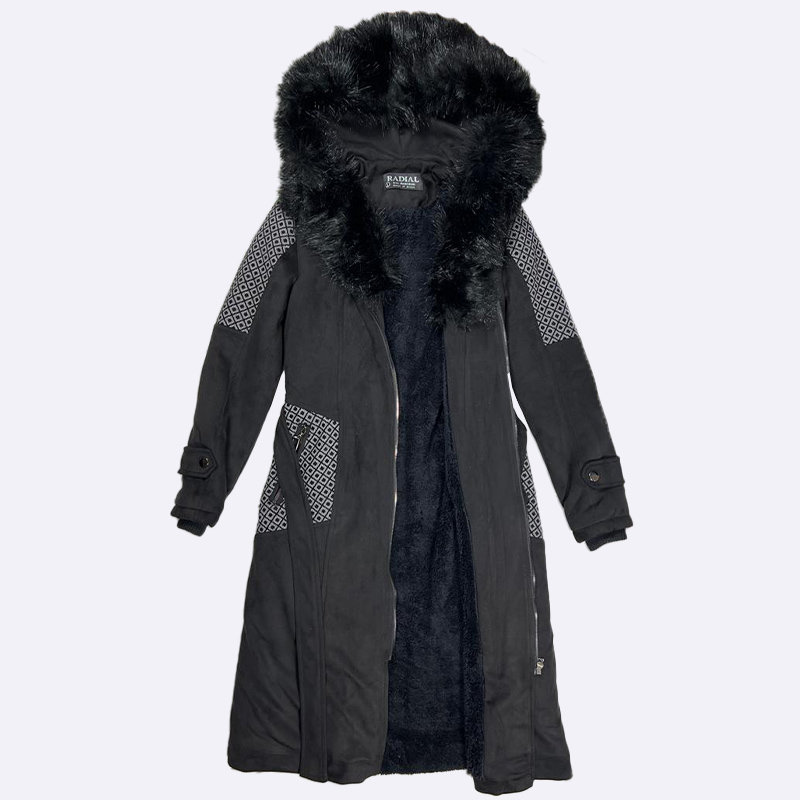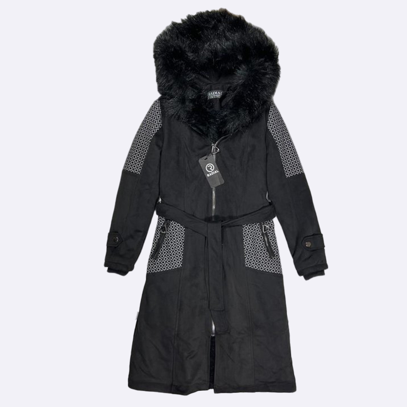 استمتعي بالأناقة والدفء مع هذا المعطف الطويل بقلنسوة من الفرو الصناعي الأسود. تصميم أنيق وعصري يضفي لمسة فخمة على إطلالتك الشتوية.