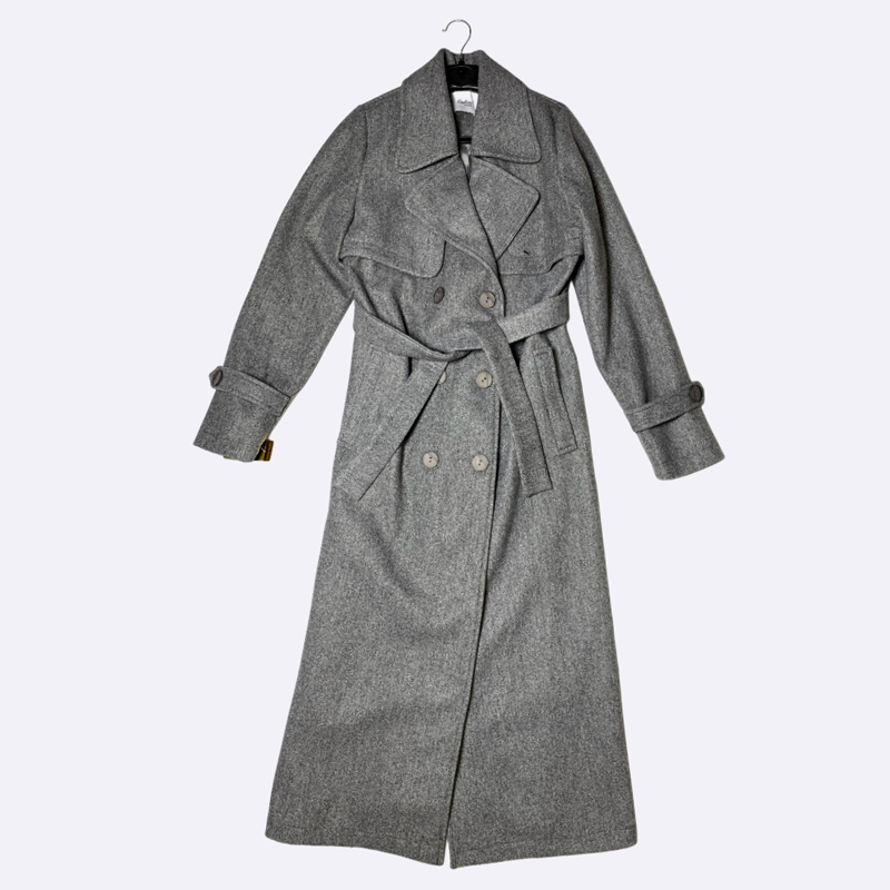 معطف نسائي شتوي طويل بقصة الترنشكوت الكلاسيكية، يتميز بلون رمادي مائل إلى الأزرق (أزرق رمادي) وخامة سميكة من مزيج الصوف. مزود بحزام للخصر وياقة عريضة وإغلاق مزدوج الأزرار. مثالي للأناقة والدفء في الطقس البارد