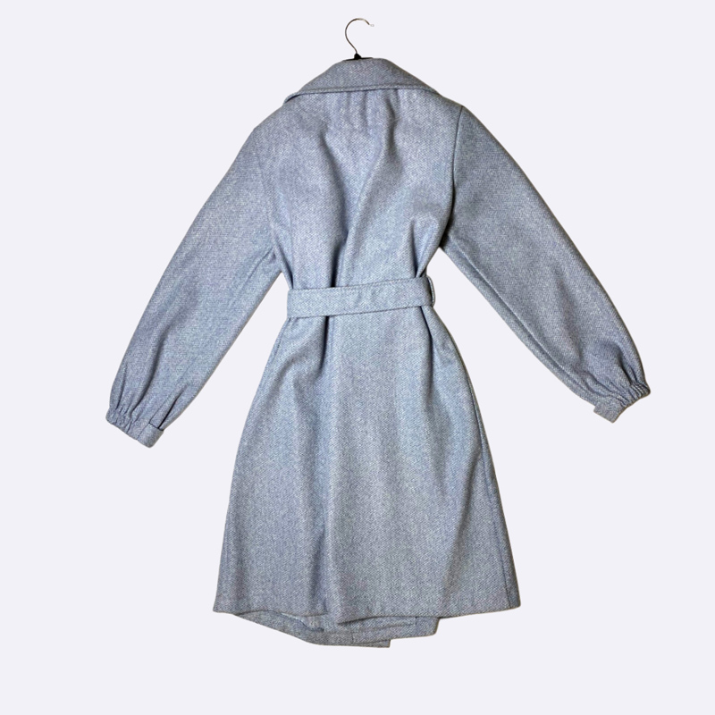 معطف شتوي بلف دافئ بطول متوسط. يتميز بغطاء رأس كبير وواسع وأكمام ذات نهاية مزمومة. يغلق بحزام خصر قماشي، وله قصة واسعة من الأسفل.
