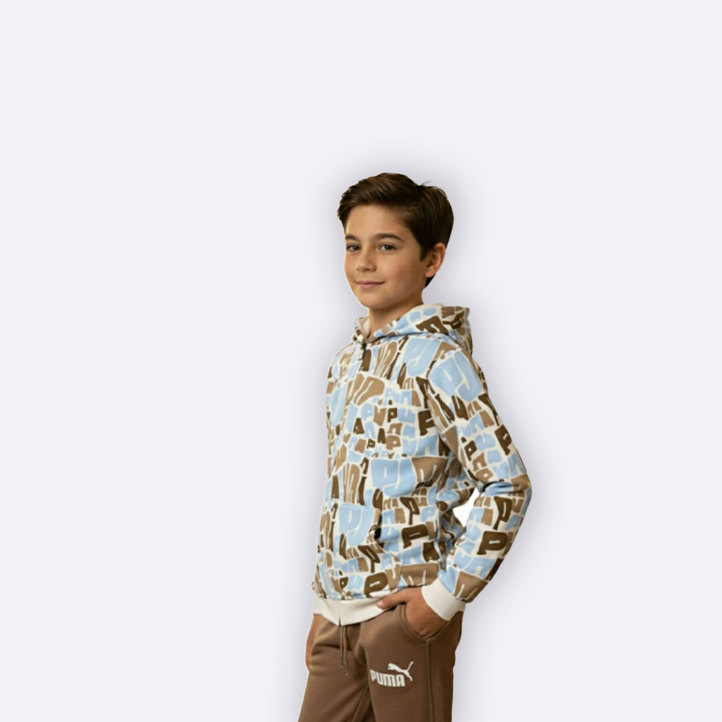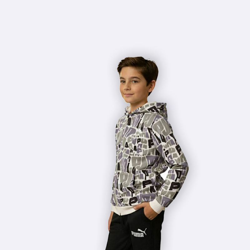طقم بجامة عملي مصنوع من فليس مصوف تركي، يتكون من جاكيت بسحاب مع طاقية مبطنة وجيب على الصدر، إضافة إلى بنطال بزم ريب من الأسفل. يتميّز الجاكيت بطبعة Puma على كامل التصميم، والخامة مكفولة على الغسيل.