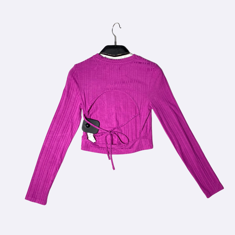 كنزة نسائية قصيرة (Crop Top) بأكمام طويلة، مصنوعة من قماش مضلع (Ribbed) وتتميز بياقة دائرية ورباط سحب جانبي.