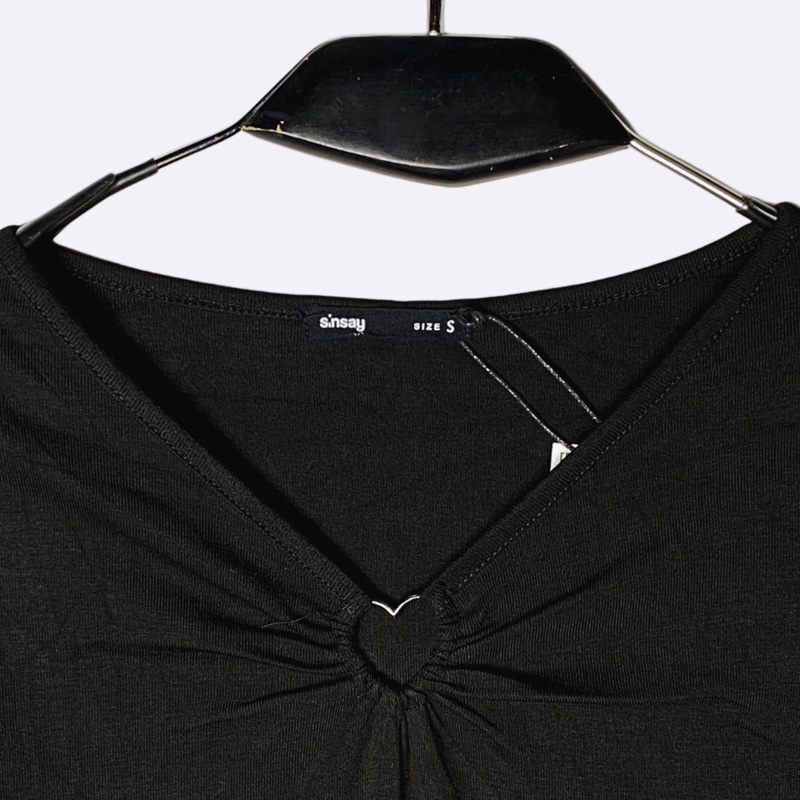 كنزة نسائية بأكمام طويلة وفتحة ياقة واسعة، تتميز بتصميم مزموم عند الصدر مع تفصيل حلقي معدني في المنتصف.
