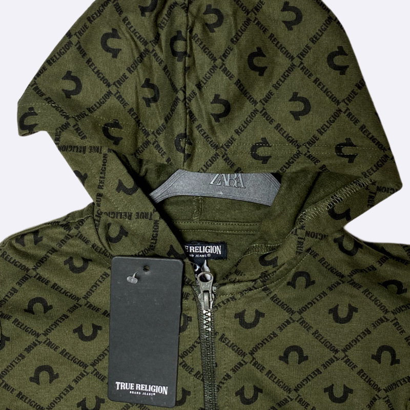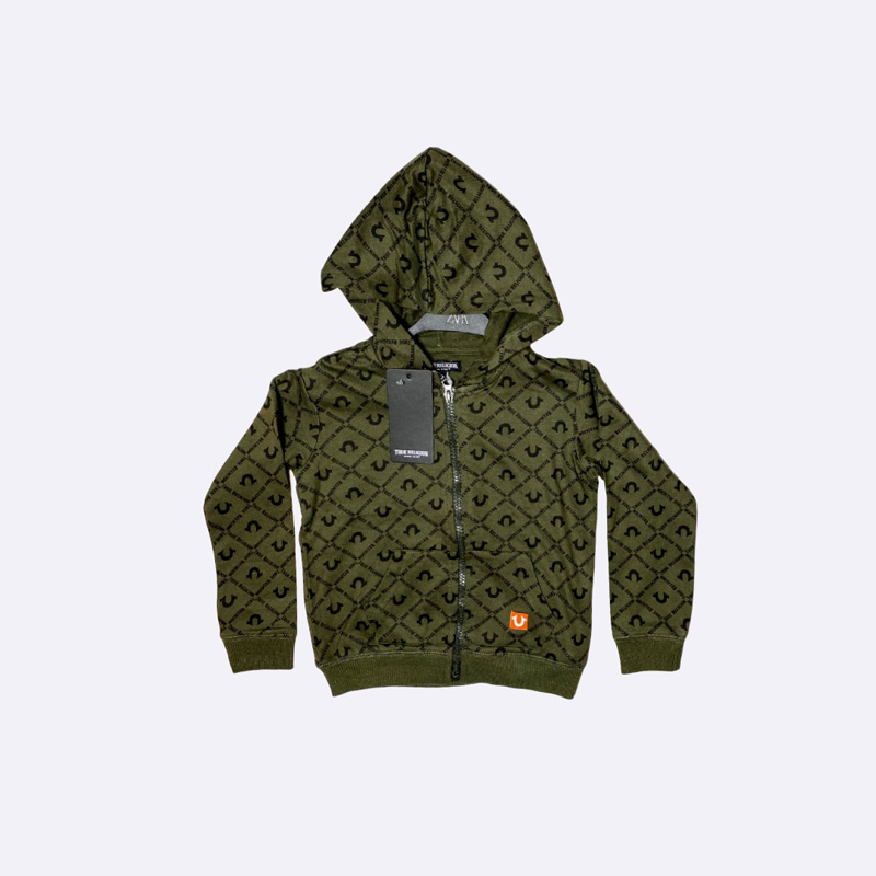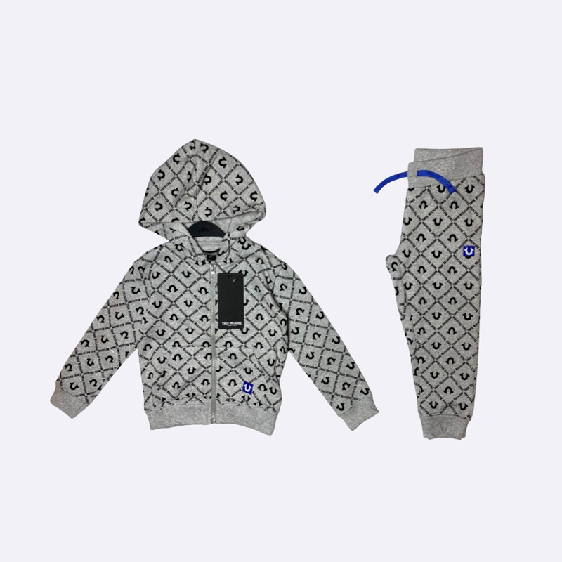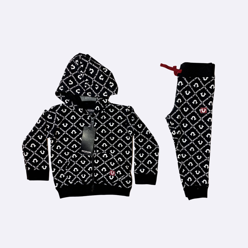 طقم ولادي مميز من علامة ترو ريليجن، يتألف من هودي بسحاب مع بنطال رياضي مريح. خامة ناعمة مناسبة للاستخدام اليومي بتصميم عصري مطبوع بالكامل.