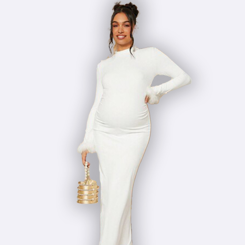 Elegant White Maternity Maxi Dress with Feather Cuffs