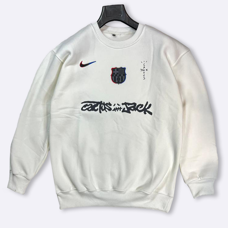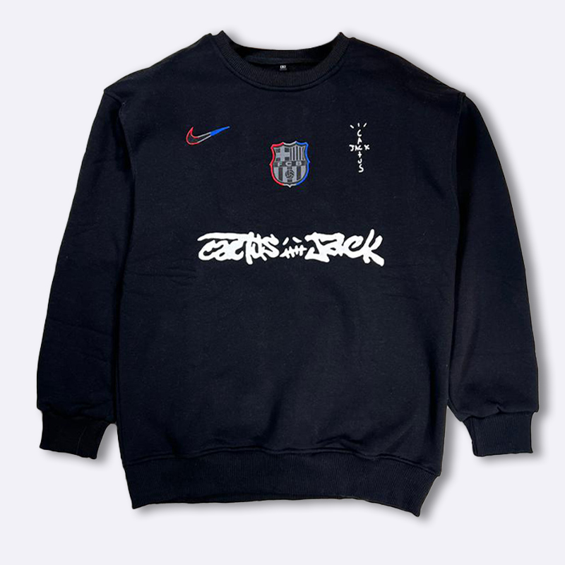 كنزة قطنية نسائية مريحة بتصميم رياضي عصري يجمع شعارات ناييكي وبرشلونة وعلامة ترافيس سكوت.