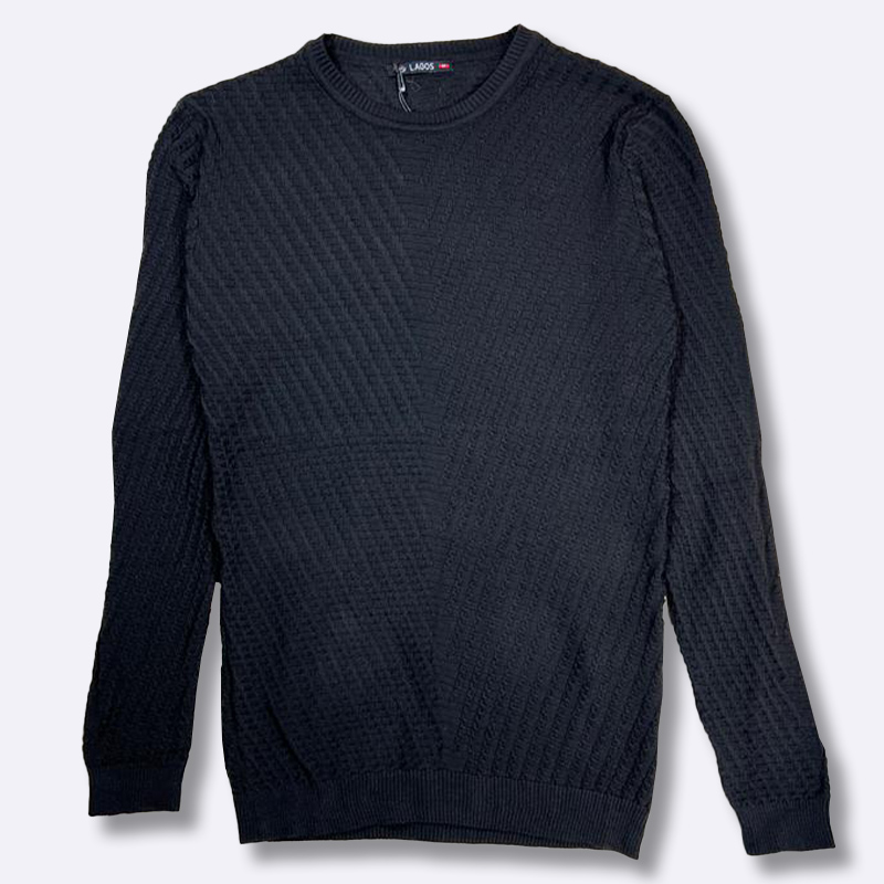 كنزة صوفية رجالية بتصميم كلاسيكي، تتميز بنقشة هندسية بارزة ولون زيتي هادئ لمظهر شتوي أنيق.