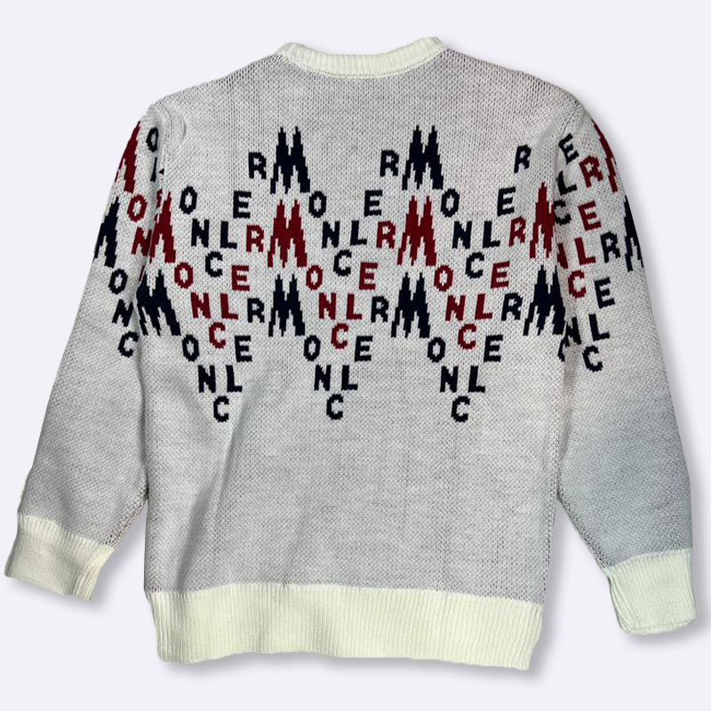 كنزة عصرية بلون رمادي فاتح مزينة بنقوش حروف مكررة باللونين الأسود والأحمر مع أطراف بيضاء.
