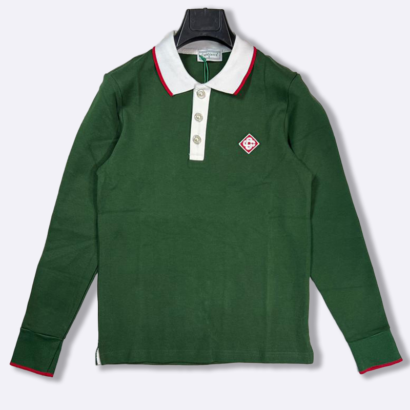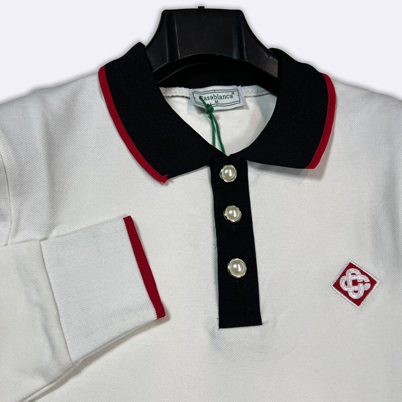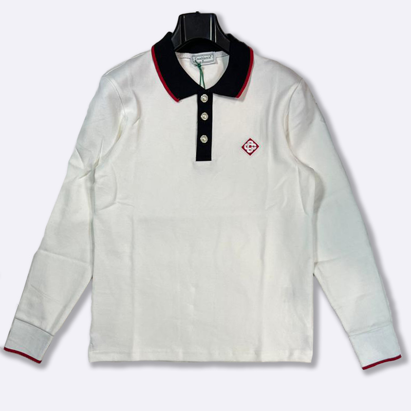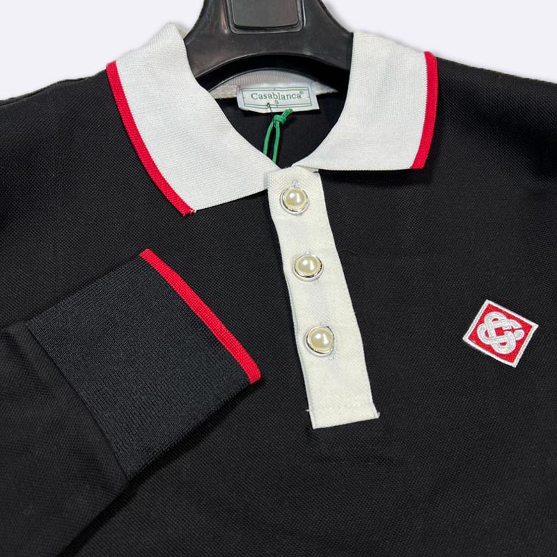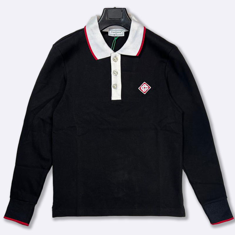 قميص بولو أسود بأكمام طويلة، يتميز بياقة وأزرار بيضاء مع تفاصيل حمراء وشعار العلامة على الصدر.