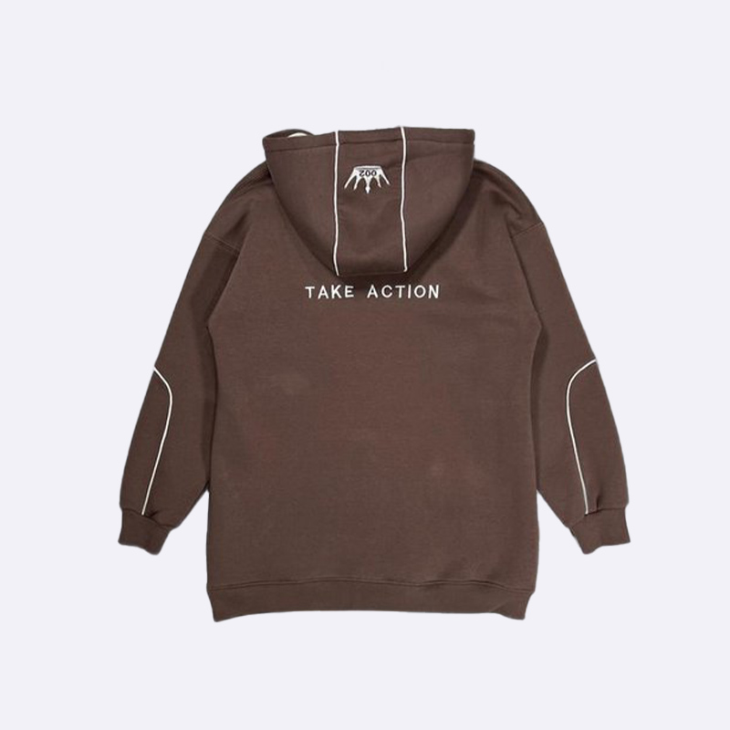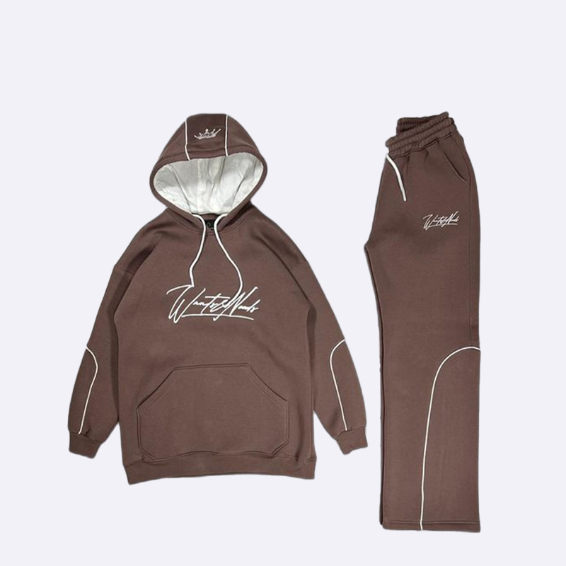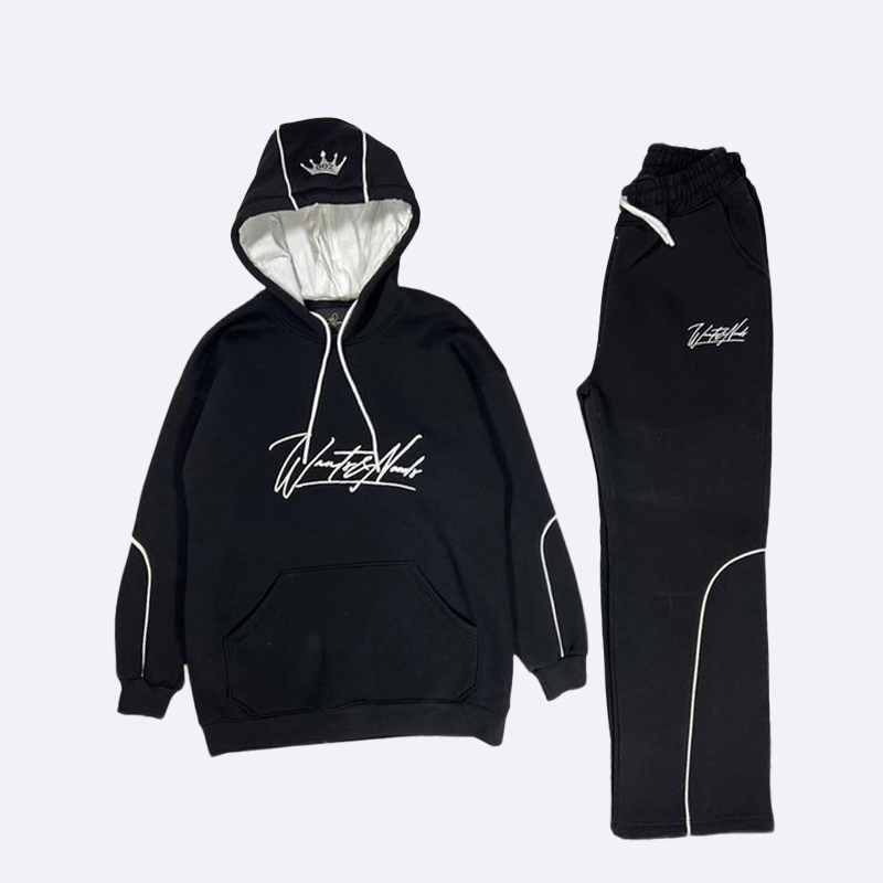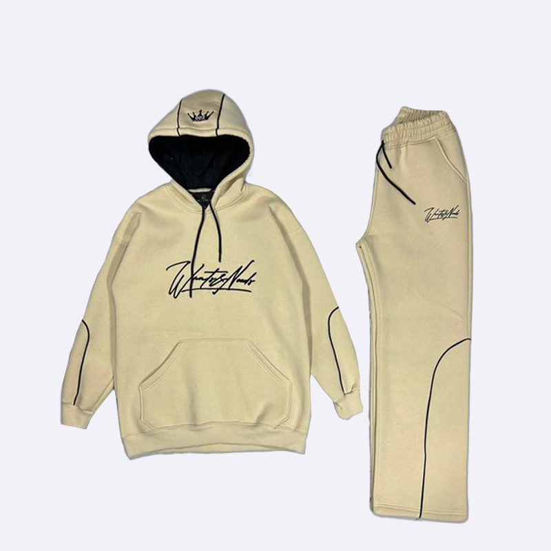 طقم مريح يتكون من هودي بقلنسوة وبنطال بجيوب جانبية، مزين بتفاصيل خطوط وتطريز أنيق.