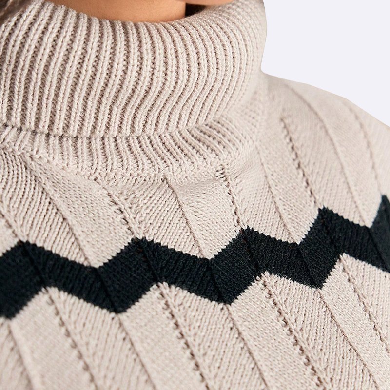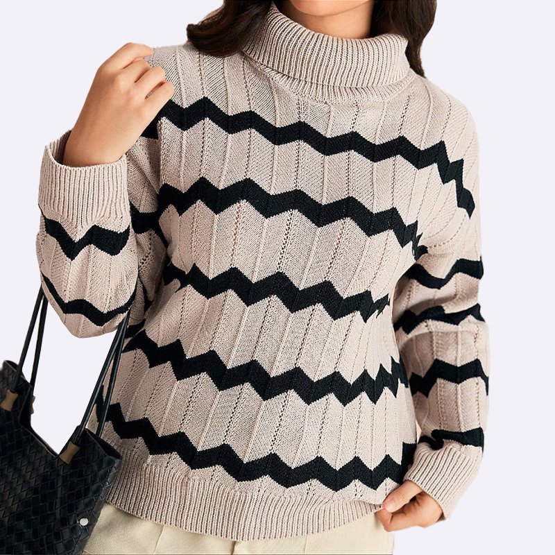تألقي بأناقة مع هذه الكنزة ذات الياقة العالية ونقشة الشيفرون العصرية. تصميم مريح وأنيق يضفي لمسة دافئة على إطلالتك.