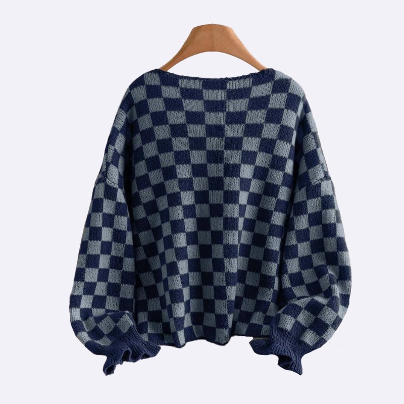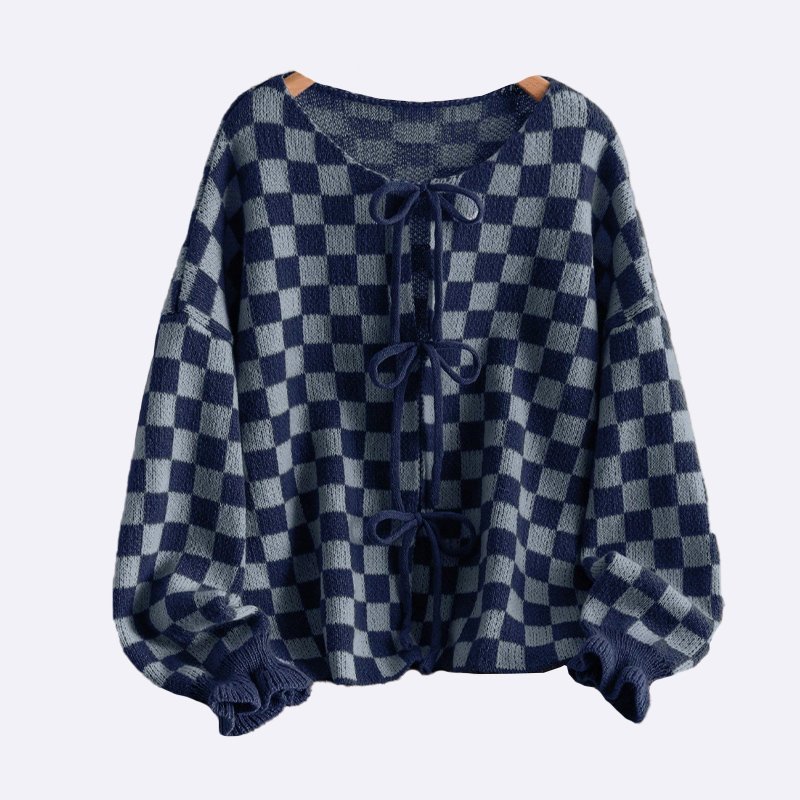 تألقي بإطلالة عصرية مع هذا التوب المحبوك بتصميم مربعات أنيق. يتميز برباط أمامي وأكمام بالون لإطلالة مريحة وعصرية.