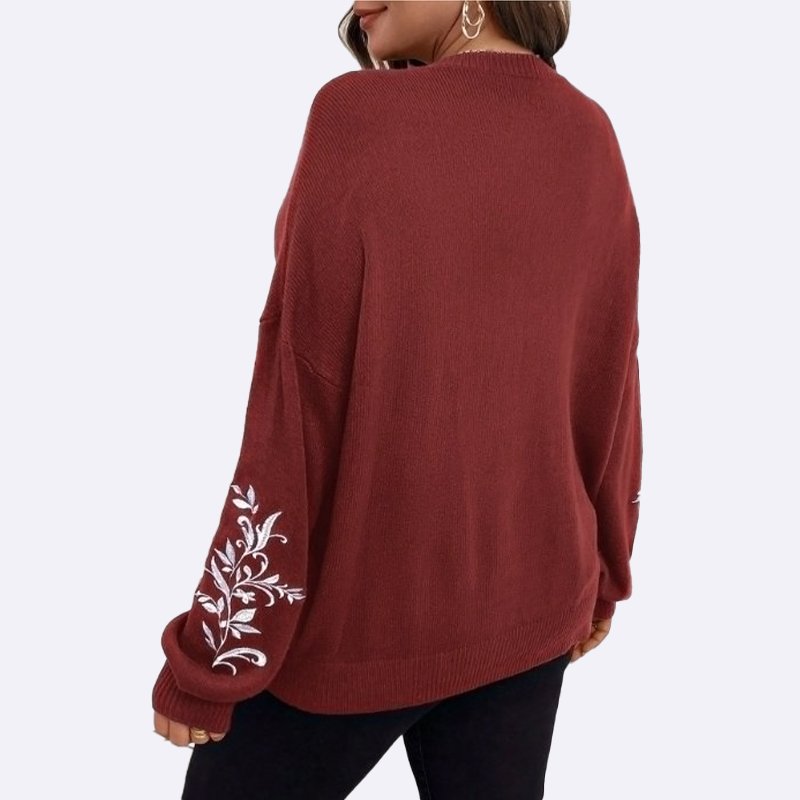 استمتعي بإطلالة مريحة وأنيقة مع هذه الكنزة التريكو الفضفاضة. تصميم مطرز بالزهور يضفي لمسة جمالية فريدة. مثالية لأيام الخريف والشتاء.