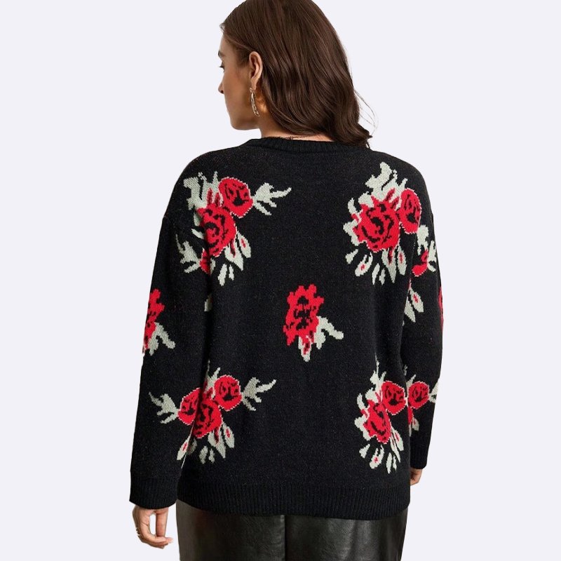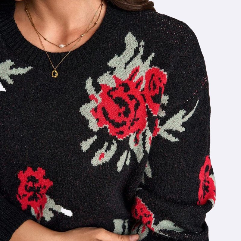 انعمي بالدفء والأناقة مع هذه الكنزة التريكو المزينة بالورود. تصميم عصري ومريح يضفي لمسة جمالية على إطلالتك.