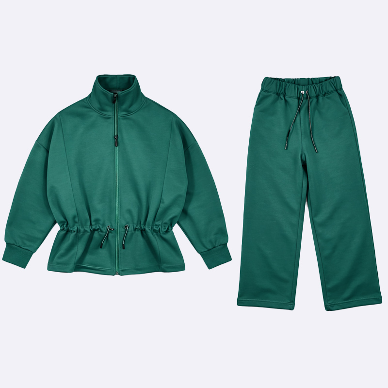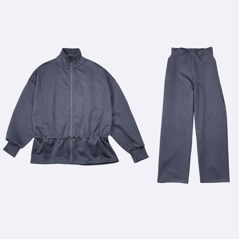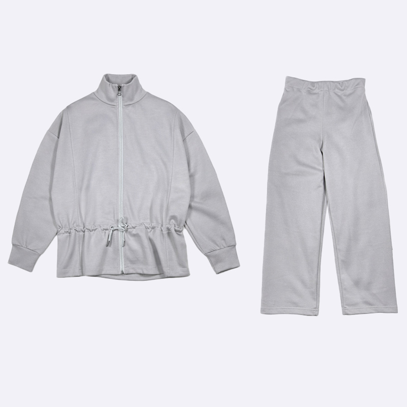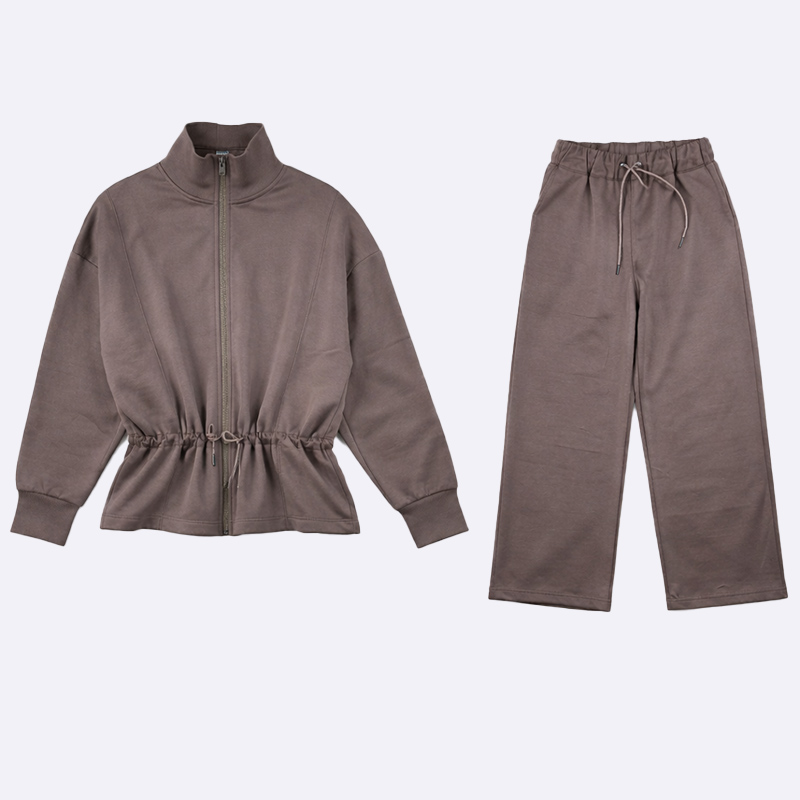 استمتعي بإطلالة عصرية ومريحة مع هذا الطقم الرياضي النسائي الأنيق. يتميز بجاكيت بسحاب وبنطلون واسع الأرجل، مما يجعله مثالياً للاسترخاء أو الخروج في نزهة.