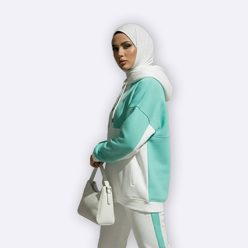 تألقي بإطلالة رياضية عصرية مع هذا الطقم المكون من قطعتين باللونين النعناعي والأبيض، بالإضافة إلى حجاب مطابق لإطلالة محتشمة وأنيقة. مثالي للأنشطة اليومية والرياضية.