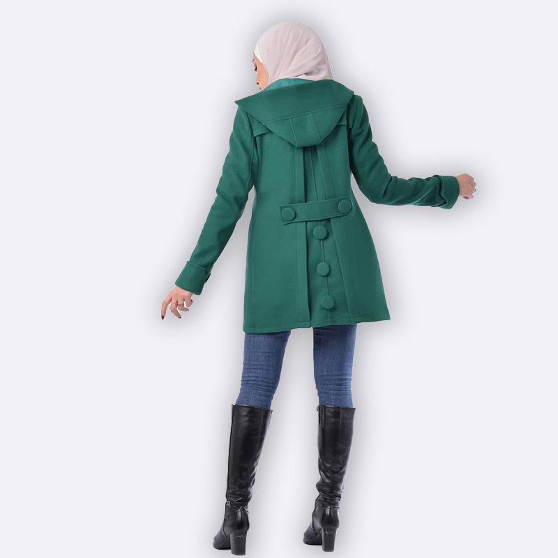 تألقي بأناقة مع هذا المعطف الزمردي الأخضر. تصميم فريد مع غطاء رأس وأزرار خلفية تضفي لمسة عصرية ومميزة لإطلالتك.