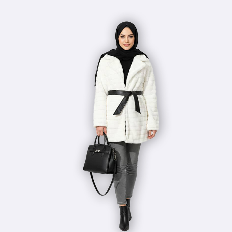 استمتعي بالدفء والأناقة مع هذا المعطف الفرو الصناعي الأنيق. تصميم عصري بحزام يضفي لمسة جمالية على إطلالتك الشتوية.