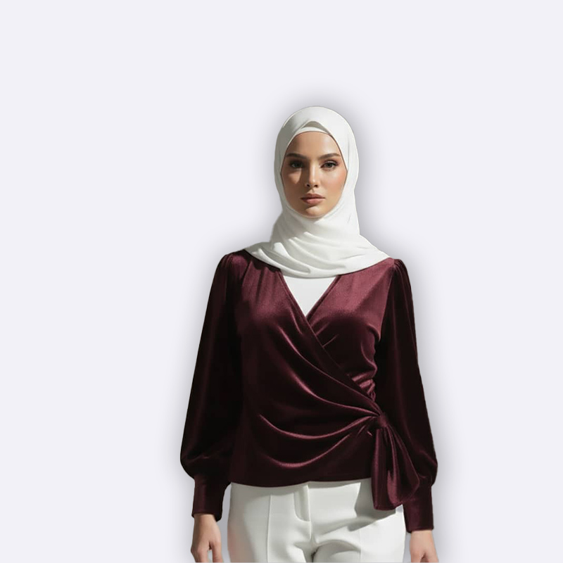 تألقي بإطلالة أنيقة مع هذه البلوزة المخملية العنابية بتصميم اللف. مثالية للمناسبات الخاصة أو لإضافة لمسة من الفخامة إلى مظهرك اليومي.