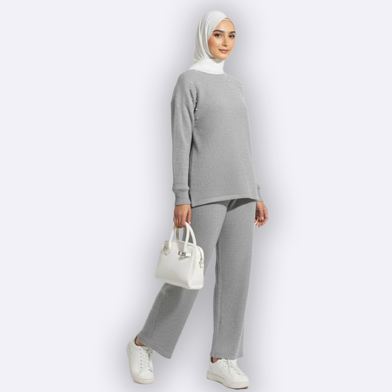 استمتعي بأناقة لا مثيل لها مع طقم الاسترخاء المحبوك والمزين باللؤلؤ. تصميم مريح وعصري يجعله الخيار الأمثل لإطلالة أنيقة ومريحة في آن واحد.