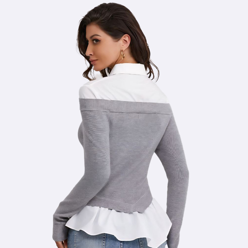 كنزة نسائية بأكمام طويلة وتصميم مبتكر بكتف مكشوف، بطبقة صوف رمادية مضلعة فوق قميص أبيض كلاسيكي، لمظهر عصري وأنيق.